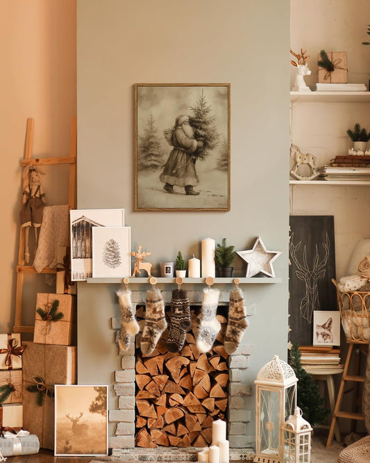 Vintage Santa Claus Carrying Christmas Tree Wall Art, Retro 12X16 Framed Canvas Print, Rustic Sepia Tone Santa with Pine Tree Artwork, Classic Winter Holiday Entryway Bedroom Home Décor