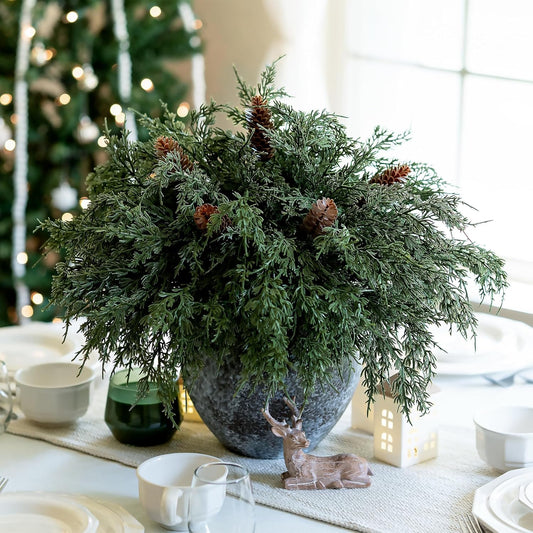 Cedar Stems Artificial Norfolk Pine Branches for Christmas Decor, 12 PCS Fake Pine Stems with 5 PCS Big Pine Cones Branches Realistic Fake Plants Faux Greenery for Vases DIY Garland Xmas Table Indoor